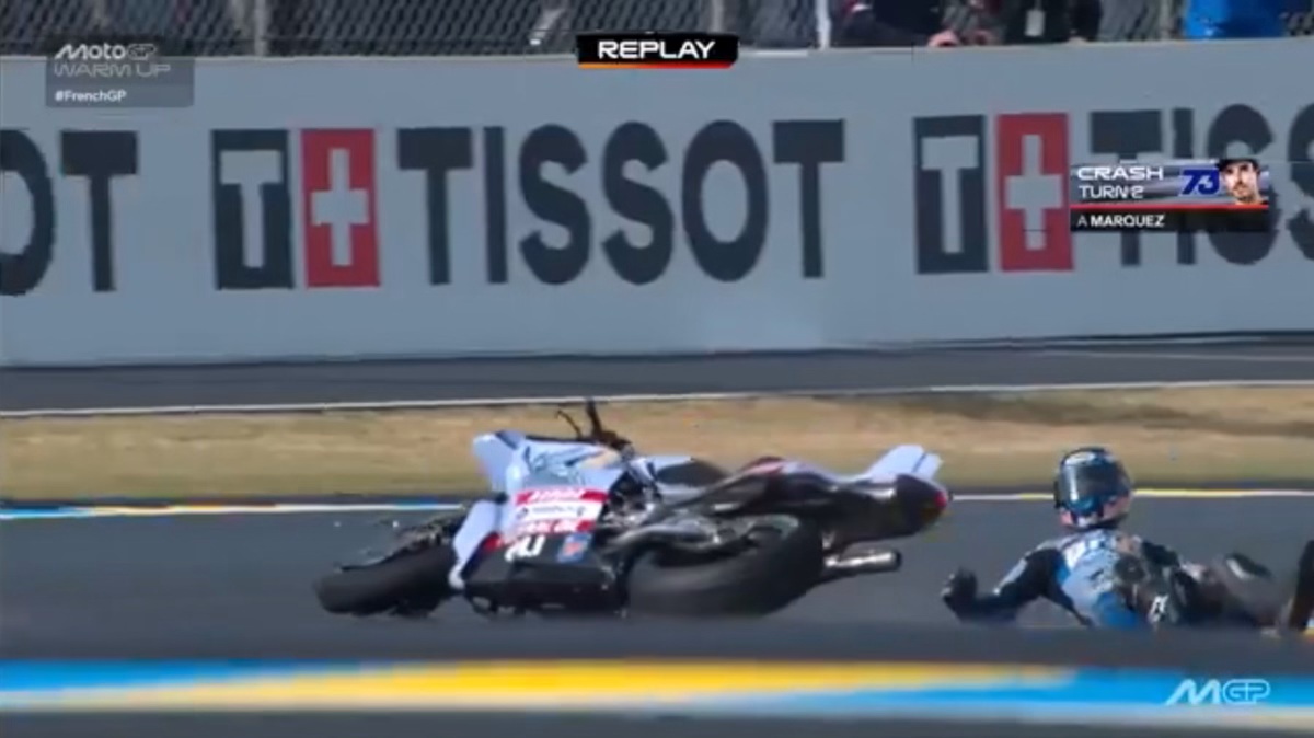 O incidente deu-se na curva 2 de Le Mans, com o piloto da BK8 Gresini a ser arrastado alguns metros no asfalto que já estava a secar apesar de ainda estar muito húmido.