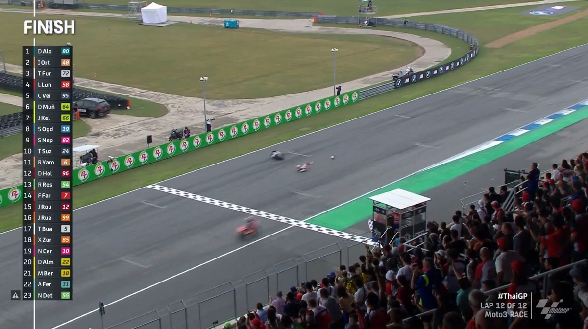 Os últimos metros da corrida do GP da Tailãndia de Moto3 foram verdadeiramente dramáticos. David Alonso garantiu a vitória, mas alguns dos seus rivais tiveram o azar a bater à porta.